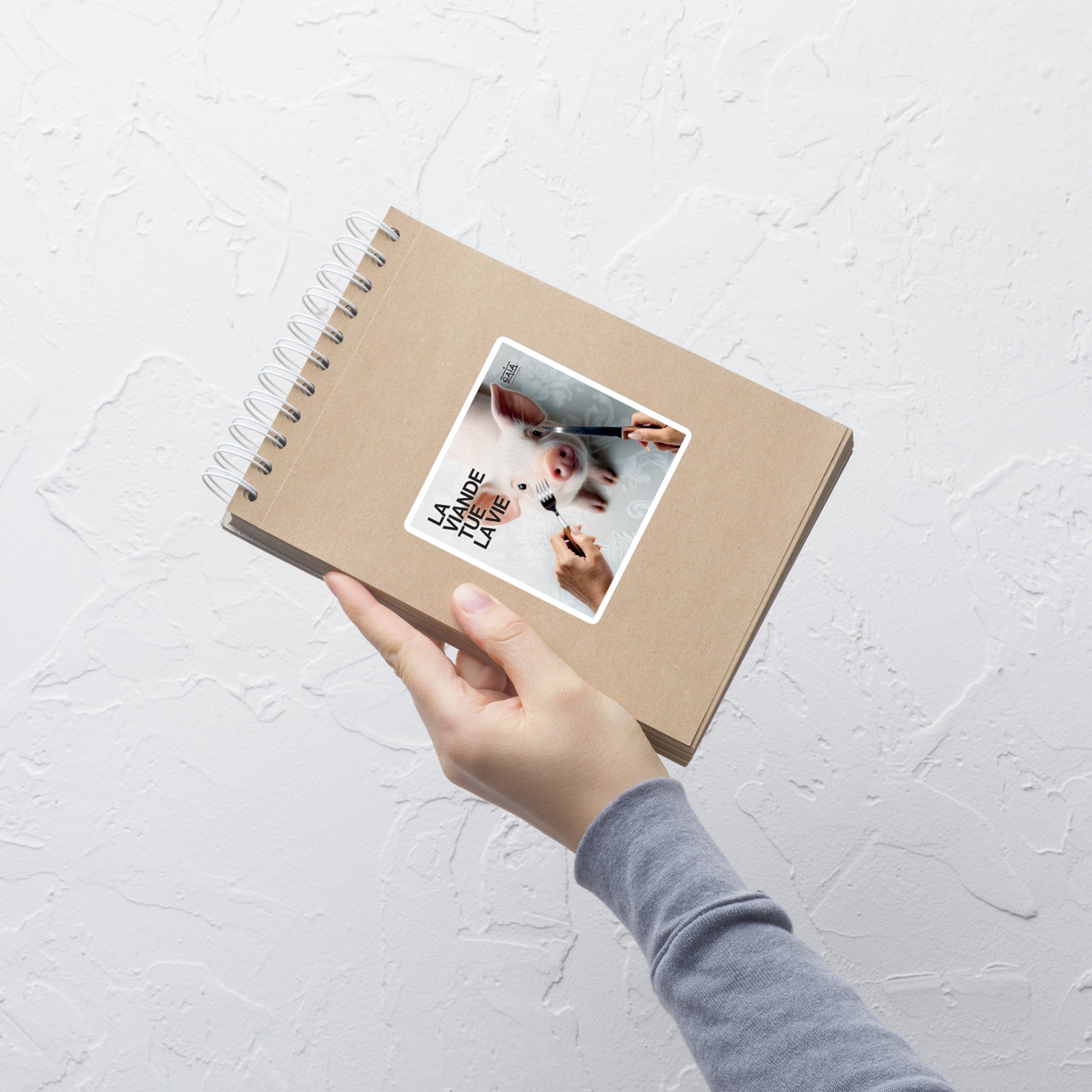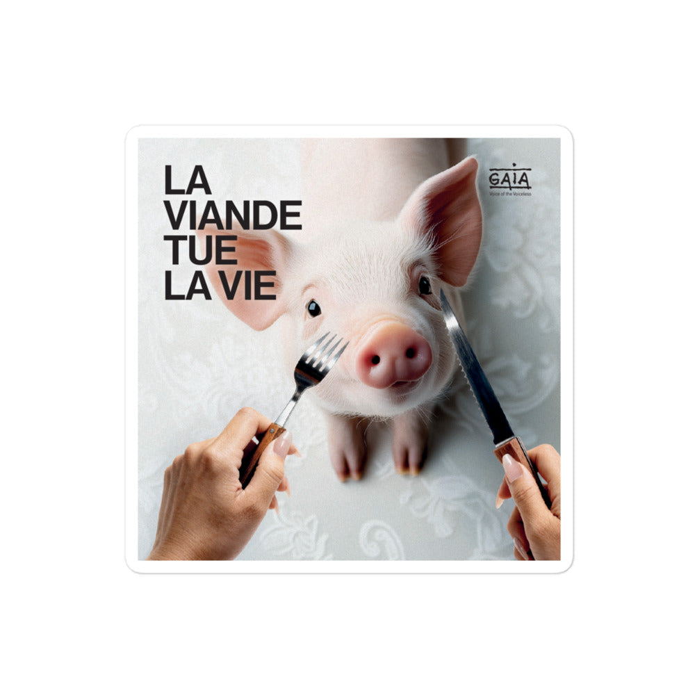 Op elke sticker kijkt het dier naar de naderende handen, gewapend met mes en vork – een treffend beeld van de realiteit die achter het vlees schuilgaat.